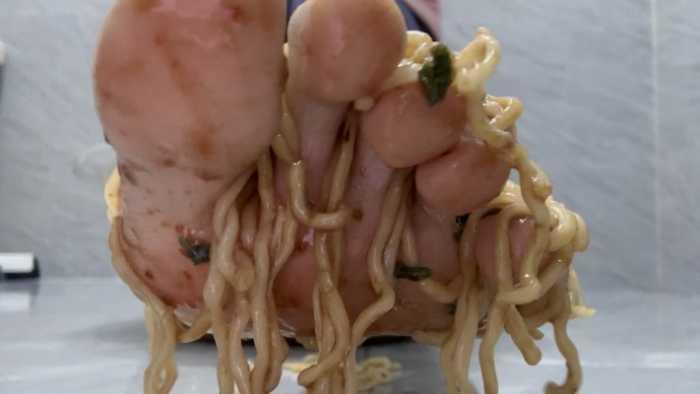 光脚搅拌葱油拌面,面和酱汁融合在一起,脚底满满的酱汁,面条包裹住玉足,脚趾夹起面条投喂屏幕前...